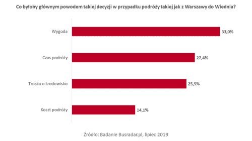 Dlaczego Polacy wybraliby podróż pociągiem? Przede wszystkim liczy się dla nich wygoda. Taką odpowiedź udzieliło 33 proc. ankietowanych. Wygoda okazuje się ważniejsza niż czas podróży (27 proc.) czy troska o środowisko (26 proc.). Najmniejsze znaczenie przy wyborze środka transportu ma koszt podróży – determinuje on wybory 14 proc. ankietowanych