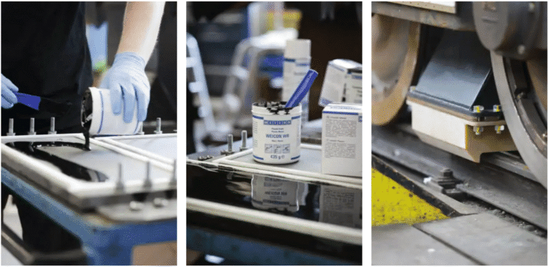 Po pełnym utwardzeniu materiału płyta formująca zostaje zdjęta, a powstała warstwa jaką tworzy żywica epoksydowa WEICON WR pozostaje na wózku. Tworzy ona stabilną, równą i precyzyjnie przylegającą powierzchnię dla montowanego elementu bezpieczeństwa.